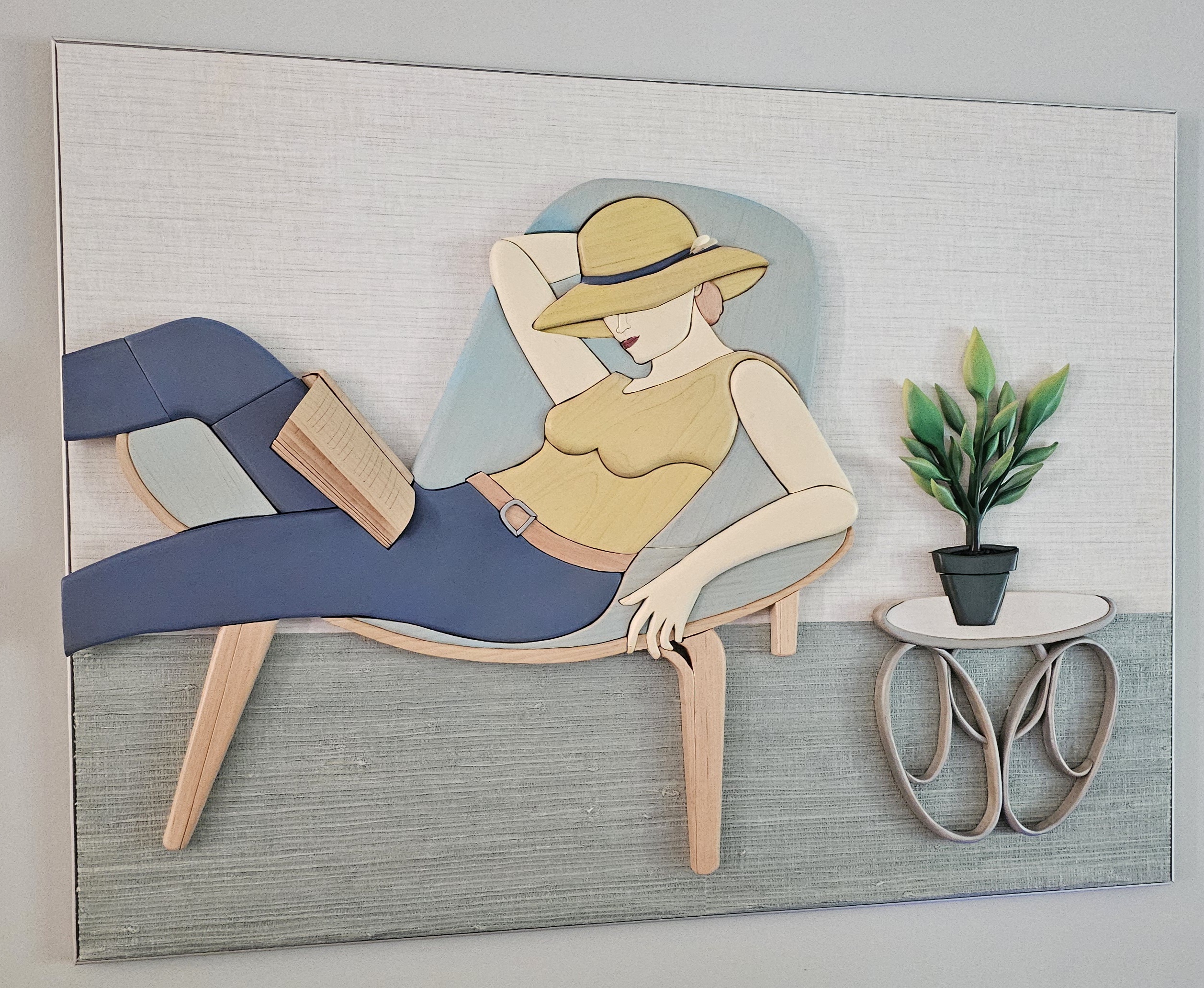 Andi Stix is an interpretive artist who creates large, wooden, 3D pieces of art. Using a technique called intarsia, various shapes, sizes, and species of wood are fitted together to create a mosaic-like picture. Some wooden pieces are raised or lowered to create an illusion of depth. Andi’s work has broken ground in the intarsia world with her integration of Japanese papers, glass, tiles, spray paint and more. She has ventured into kinetic art, which relies on the movement of the viewer to see different images from different angles. Andi has also used multiple layering effects to create movement within her designs. Click here or scroll down to see Andi’s gallery of art: